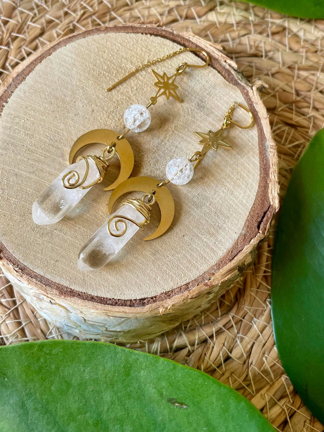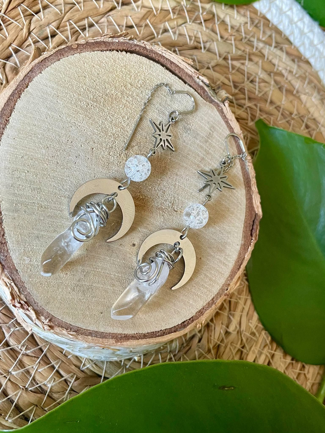 La pierre est un cristal de roche sertie de fil de cuivre.