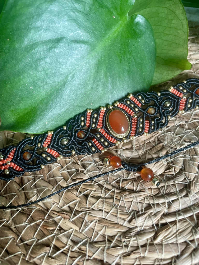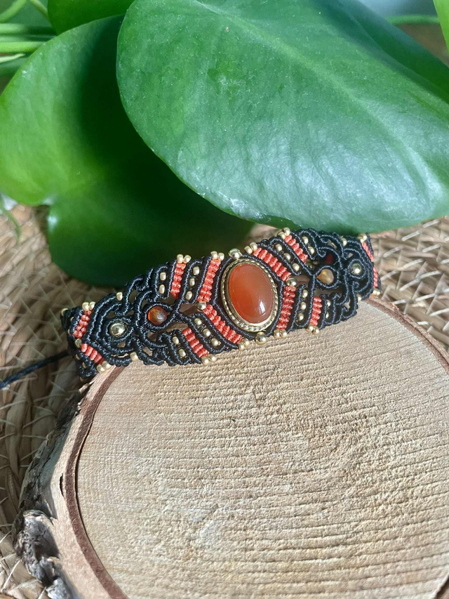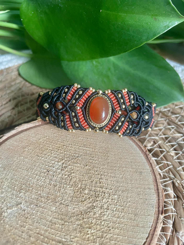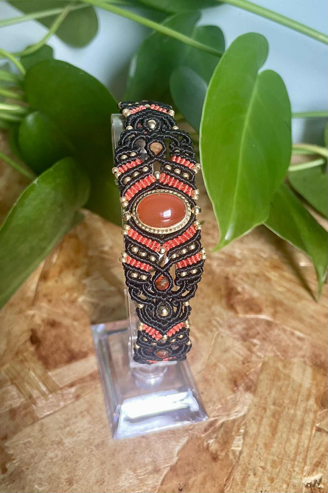 La pierre centrale est une cornaline sertie de laiton , des pierres de cornaline facettées de 4mm sont intégrées dans le tissage .