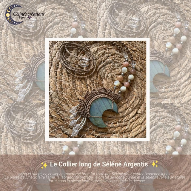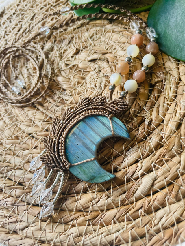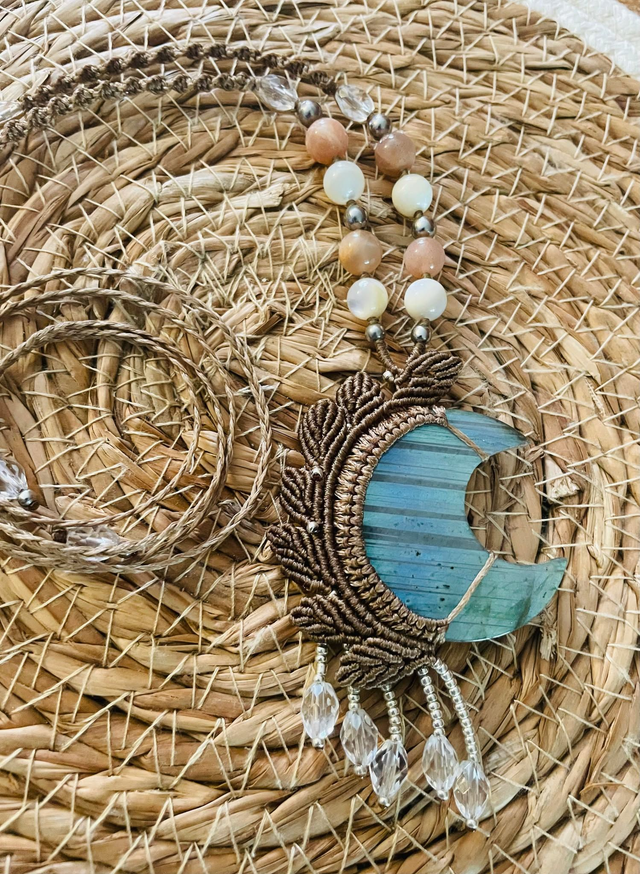 La pierre centrale est une labradorite taillée en forme de lune , des franges rappelant les rayons de lune sont apposées dessous et sont en rocailles miyuki argentées et en perles de cristal de roche facettées.