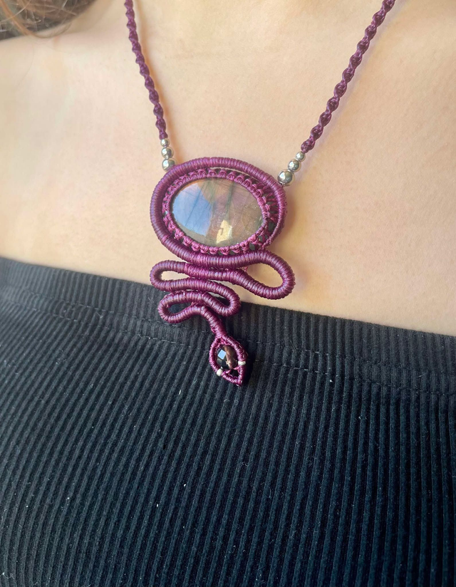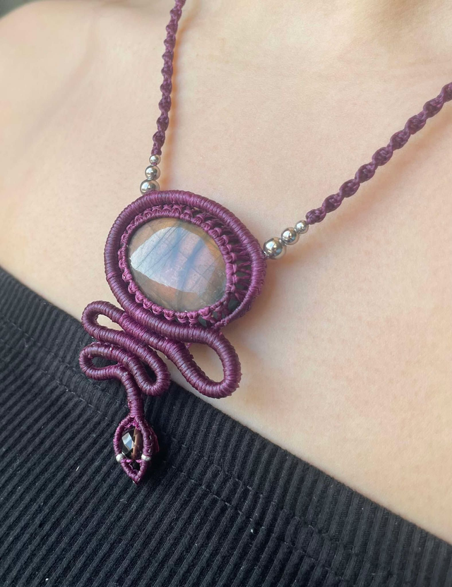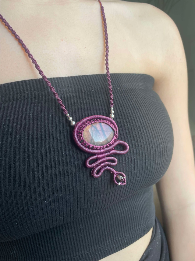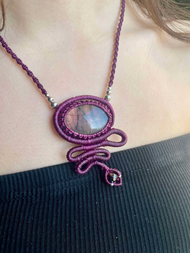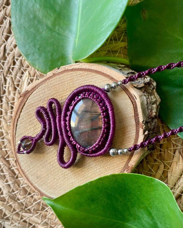 La pierre centrale est une labradorite aux reflets violet / rose / jaune .