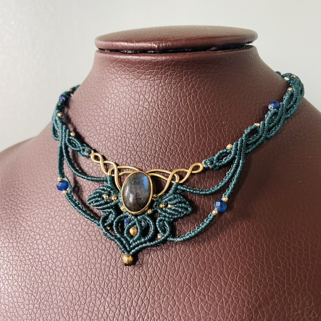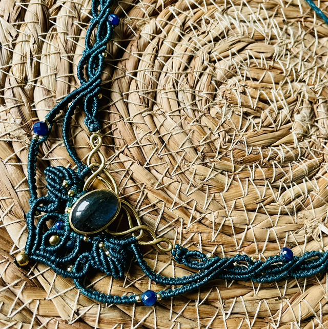 Collier en micromacramé tissé à la main dans mon atelier du sud de la France .