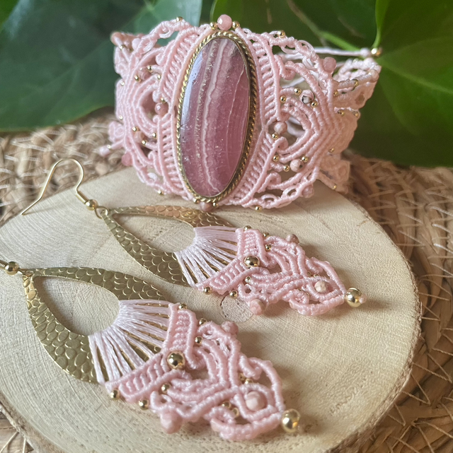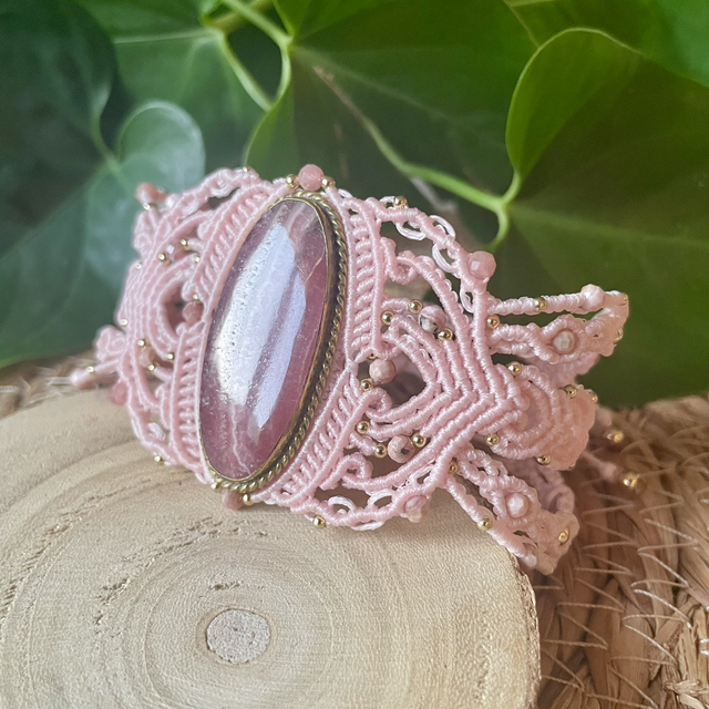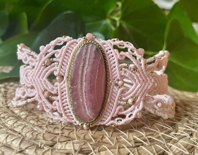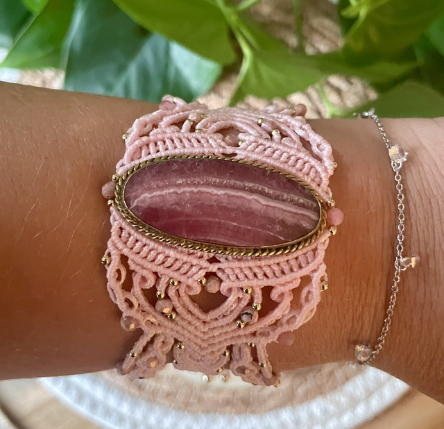 Des pierres facettées de 4mm de rhodochrosite sont intégrées dans le tissage.