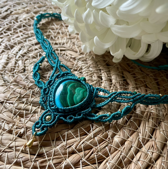 Des pierres facettées de malachite sont intégrées dans le tissage , les perles de finitions sont des perles en acier inoxydables dorées.