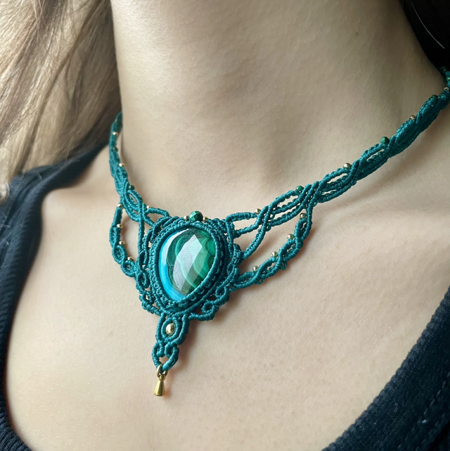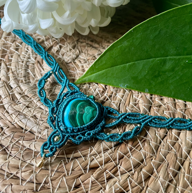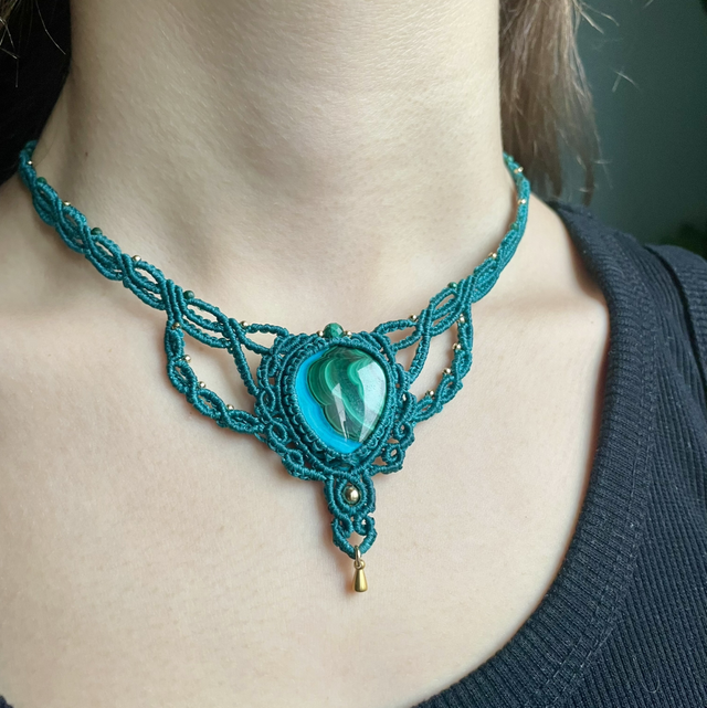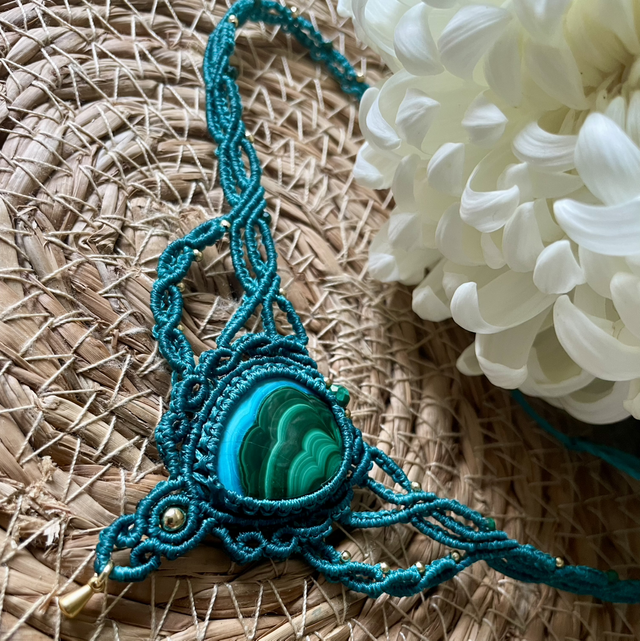 Collier tissé à la main en France avec la technique du micro-macramé .