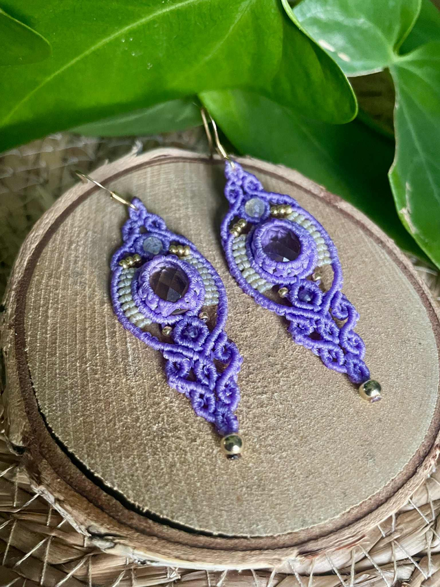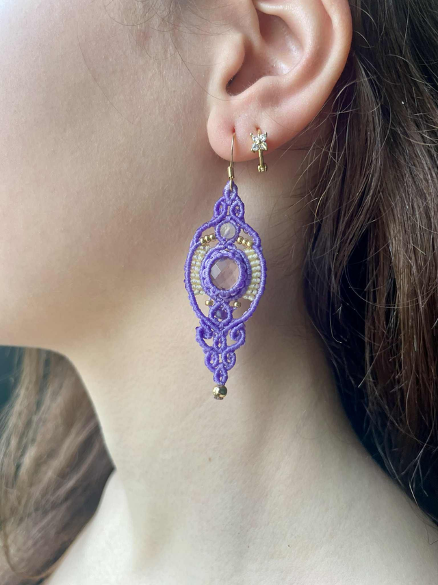 Boucles d'oreilles tissées à la main en France avec la technique du micro macramé.