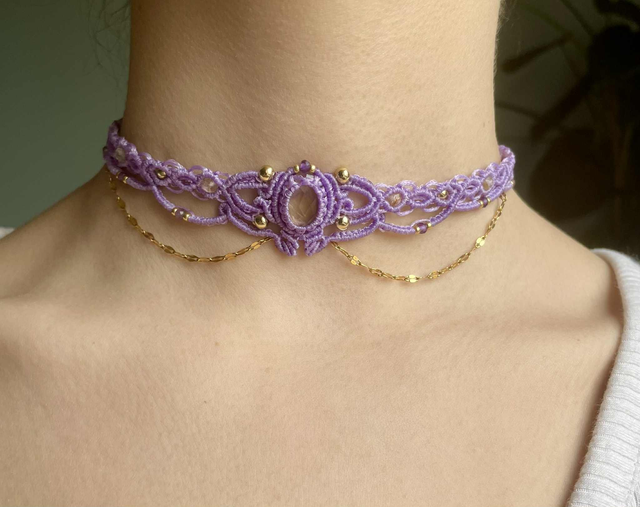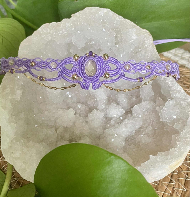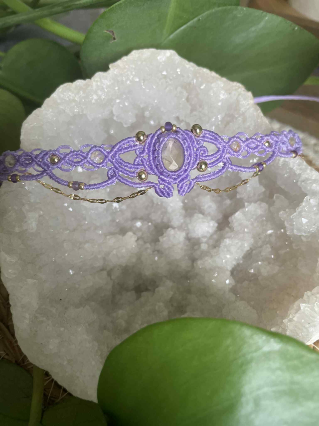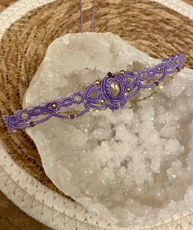 Le fil utilisé est un fil plat de 0,8 mm couleur lilas, réputé pour sa grande solidité il garantira longue vie à votre bijou.