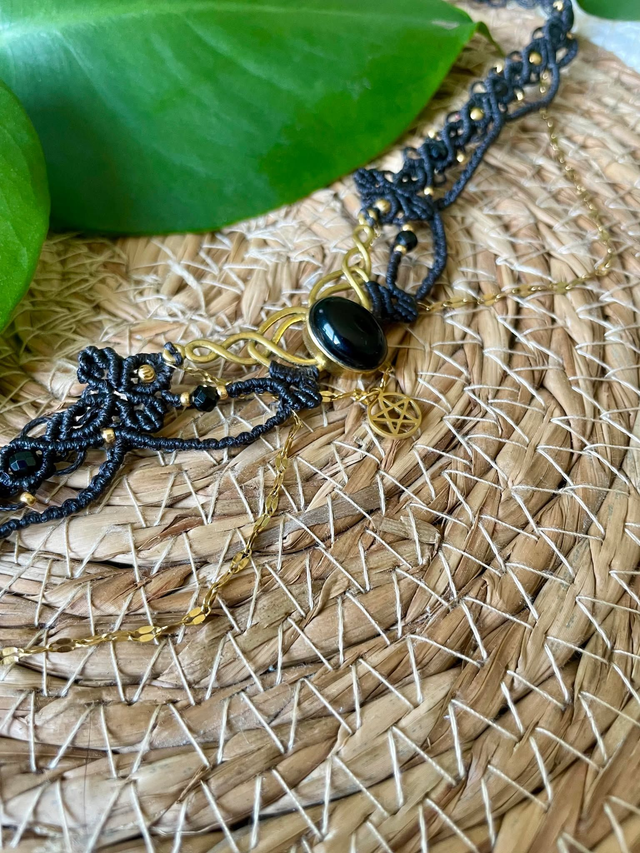 La breloque centrale est en laiton doré avec en son centre un cabochon d'Onyx.