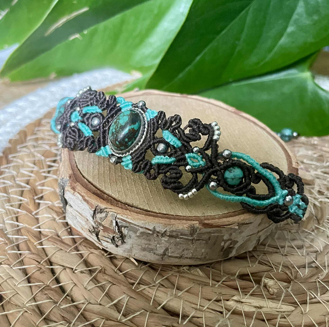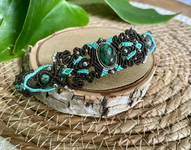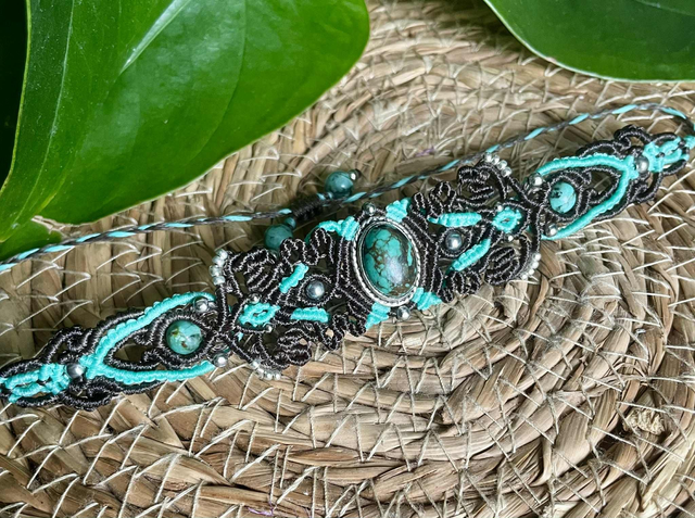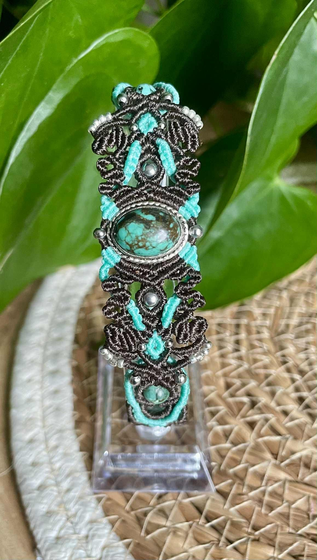La pierre centrale est une turquoise africaine sertie de laiton , des pierres de turquoise africaine de 6mm sont intégrées dans le tissage .