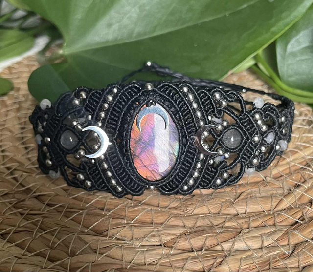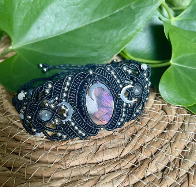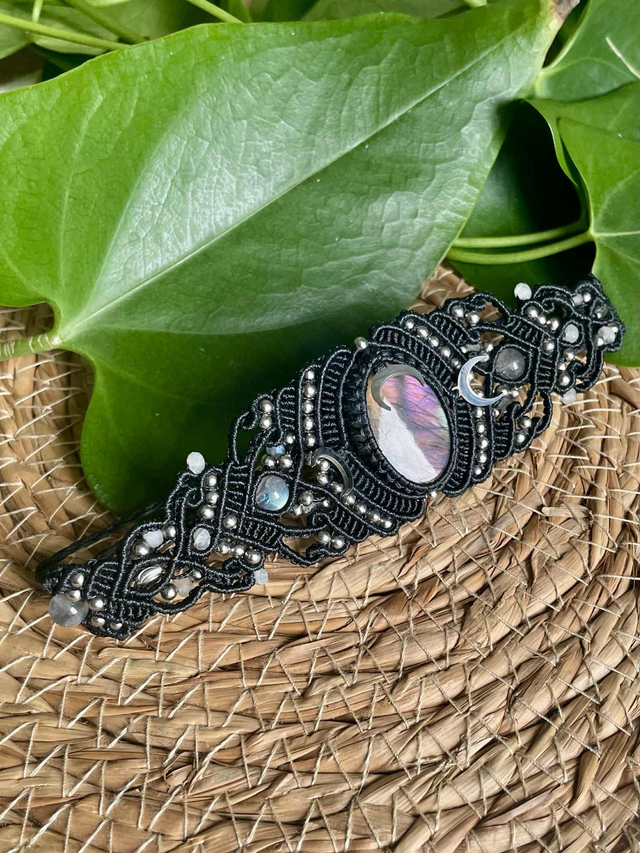 On retrouve dans le tissage des pierres de labradorite de 6mm ainsi que des perles de labradorites facettées de 4 mm.