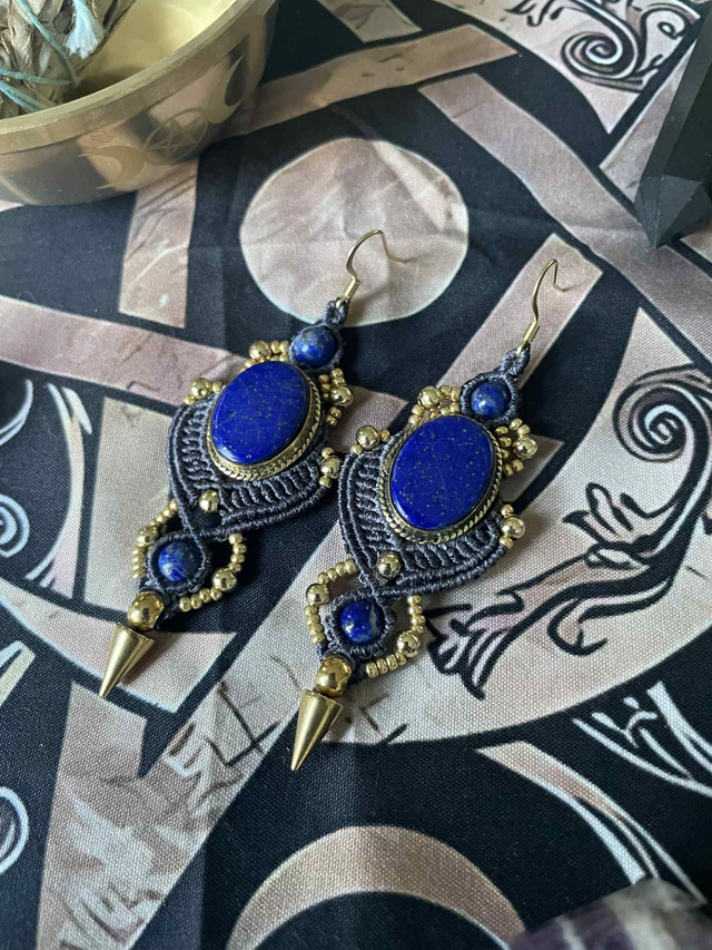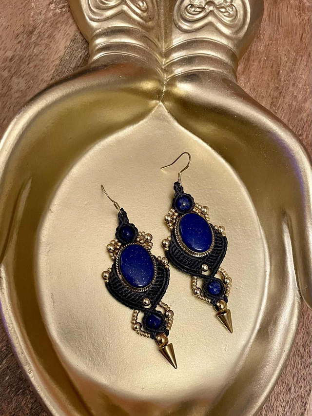 Boucles d'oreilles tissées à la main dans mon atelier du sud de la France avec la technique du micro macramé autour de pierres naturelles serties de laiton.