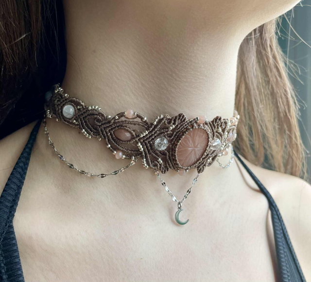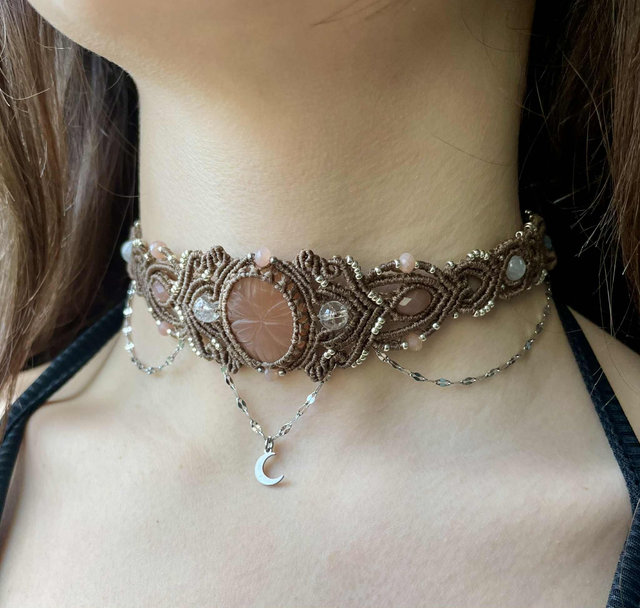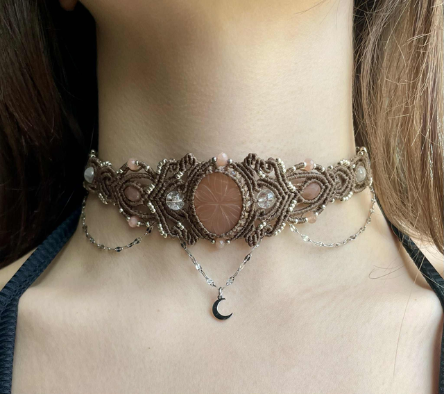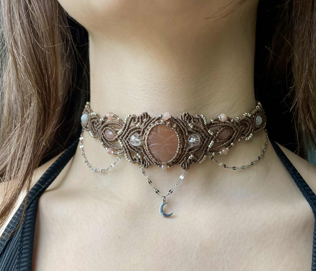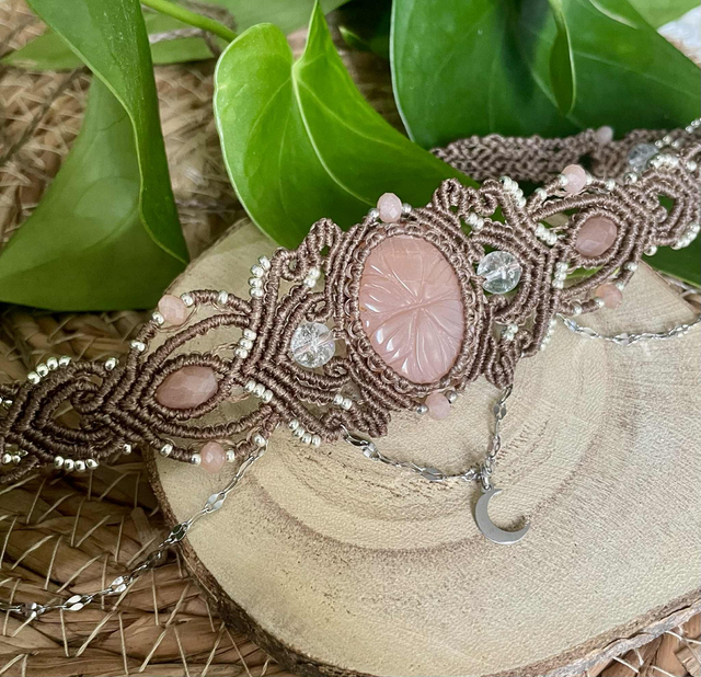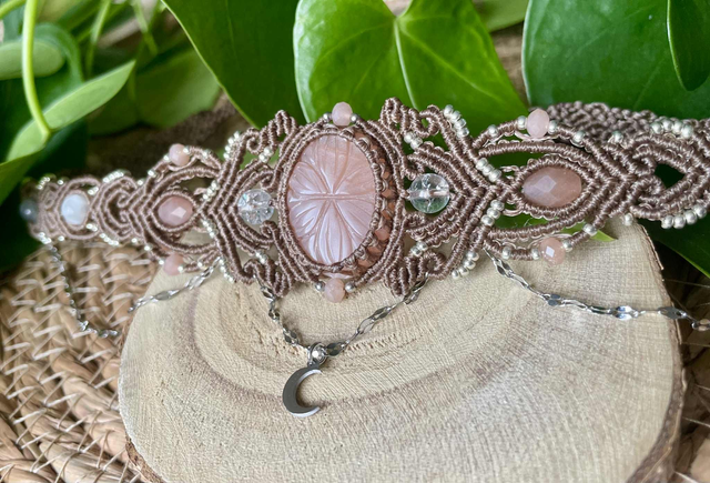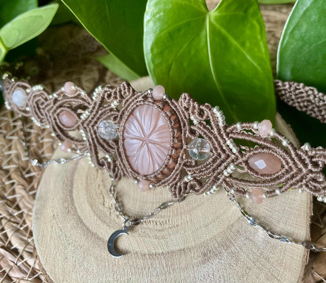 La pierre centrale est une pierre de lune pêche gravée , des perles de labradorite , de sélénite , pierre de lune pêche et de cristal de roche sont intégrées dans le tissage .