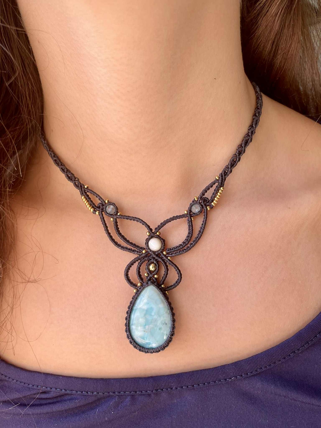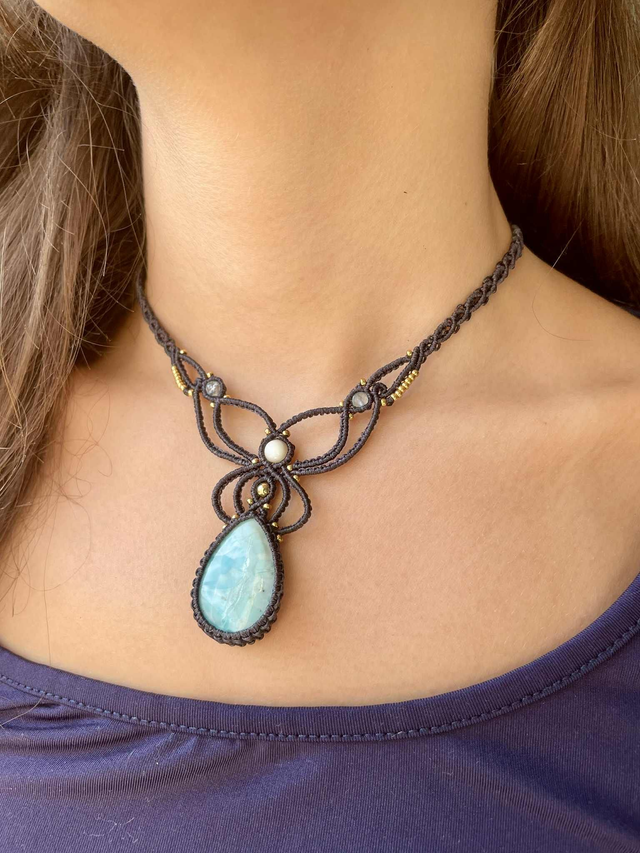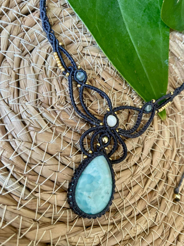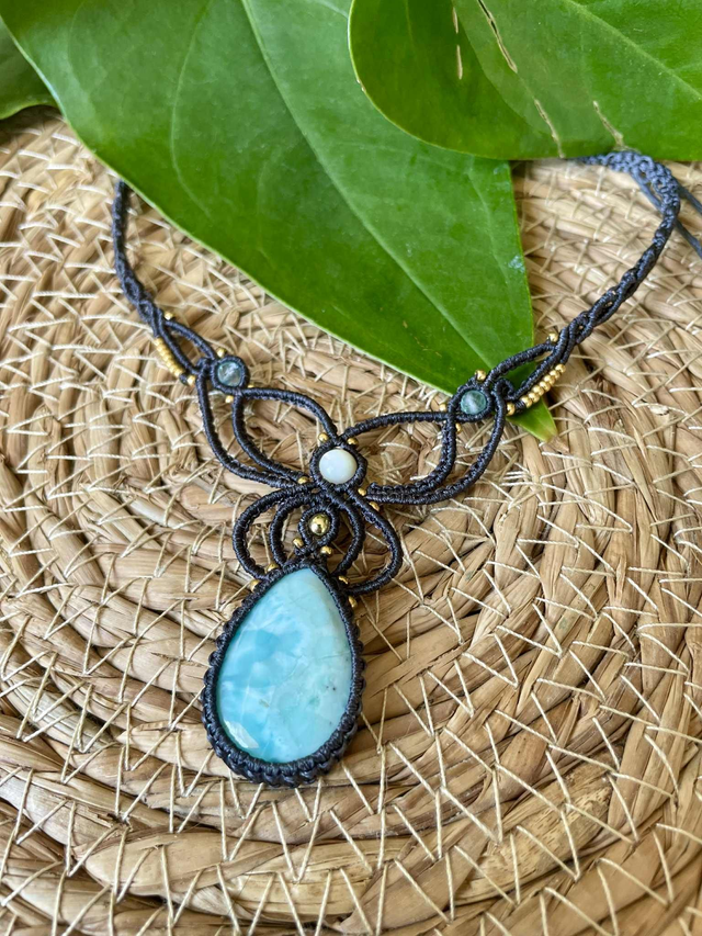 La pierre centrale est un larimar , des perles de topazes et de nacre sont intégrées dans le tissage.