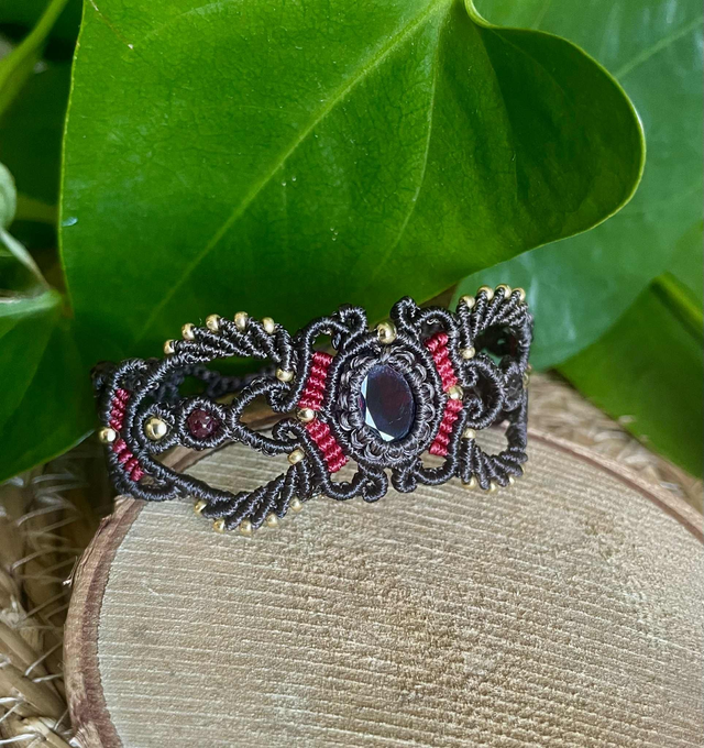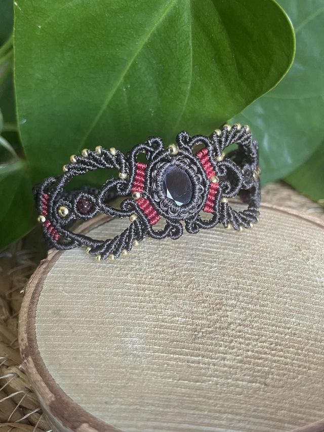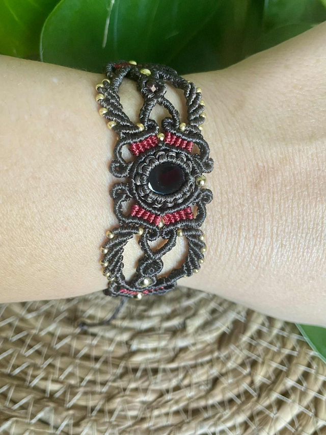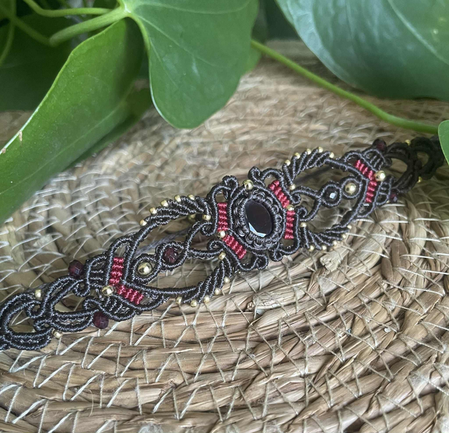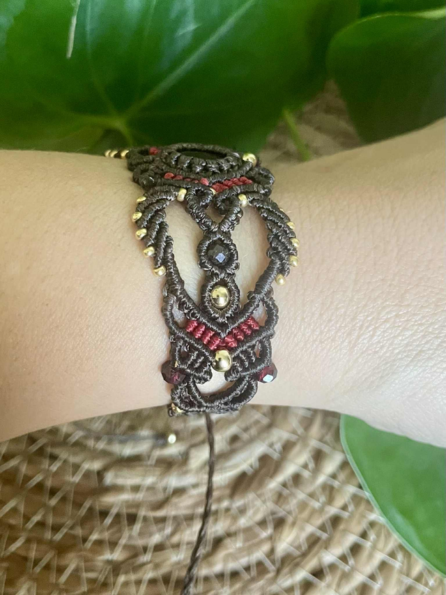 Le fil utilisé est un fil plat de 0,8 mm chocolat et rouge intense , réputé pour sa grande solidité il garantira longue vie à votre bijou.