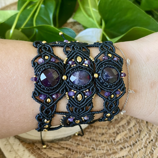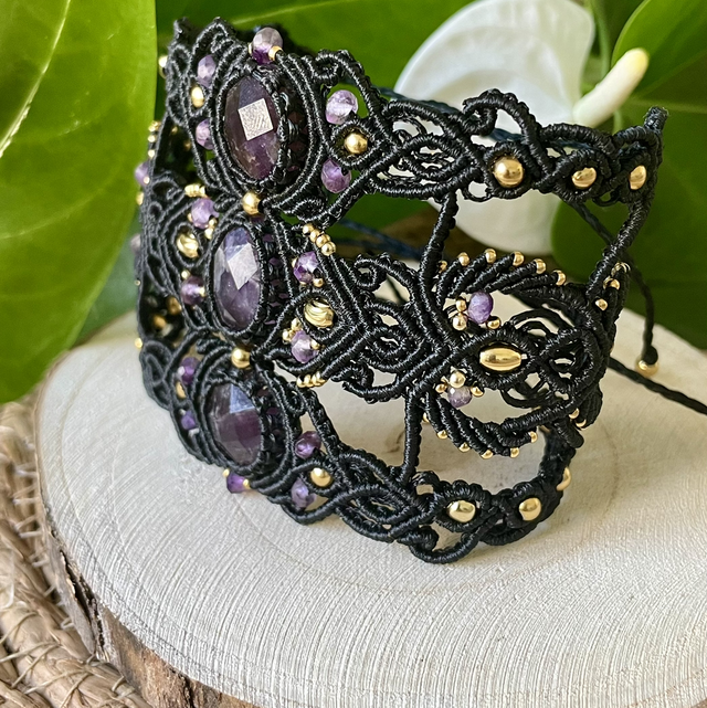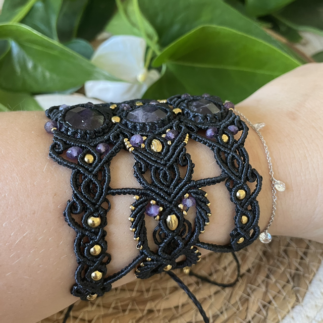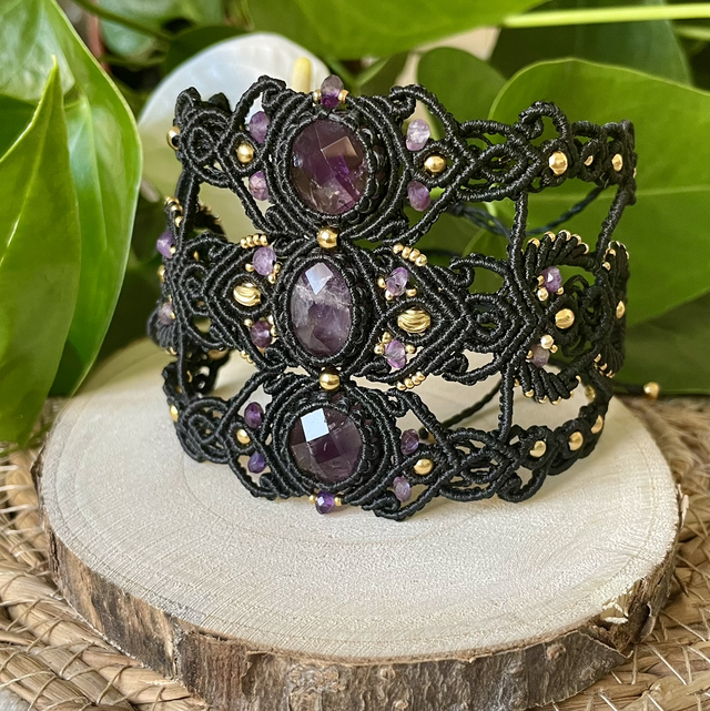 Les pierres sont des améthystes facettées , des perles de 4mm améthyste sont insérées dans le tissage.