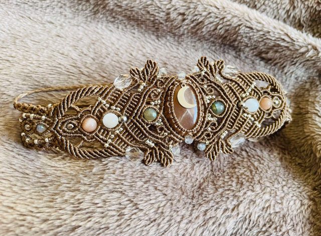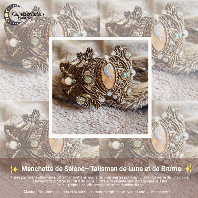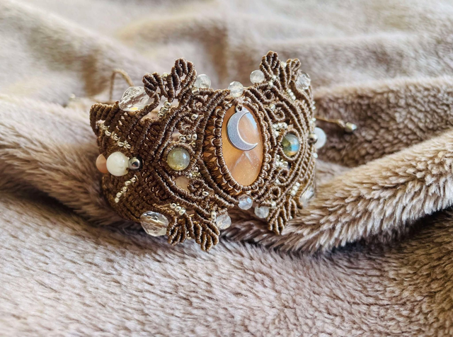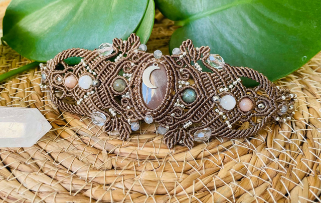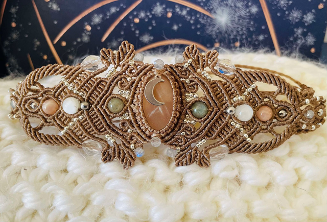 La pierre centrale est une pierre de lune pêche , des pierres de labradorite , de sélénite , de pierre de lune pêche et de cristal de roche facettées sont également intégrées dans le tissage.