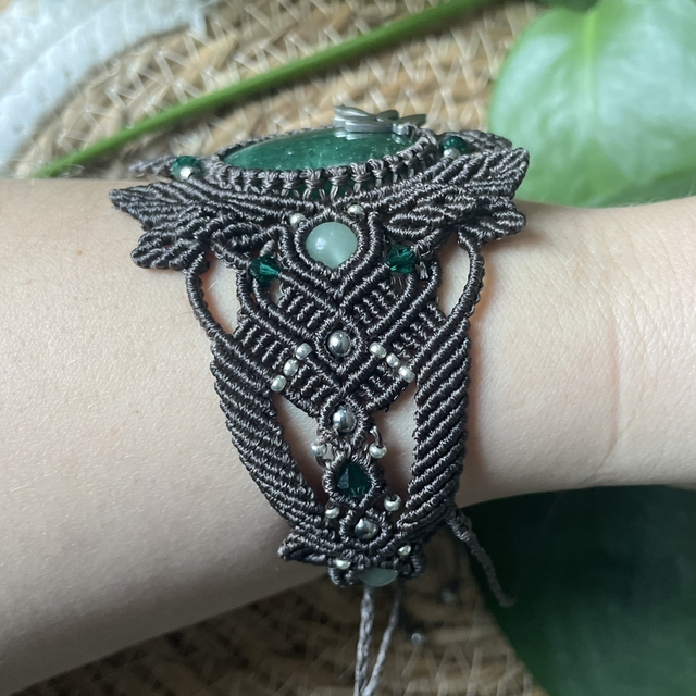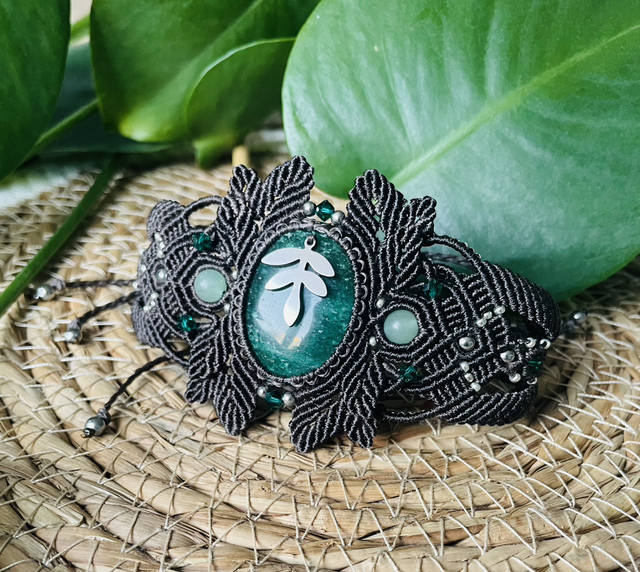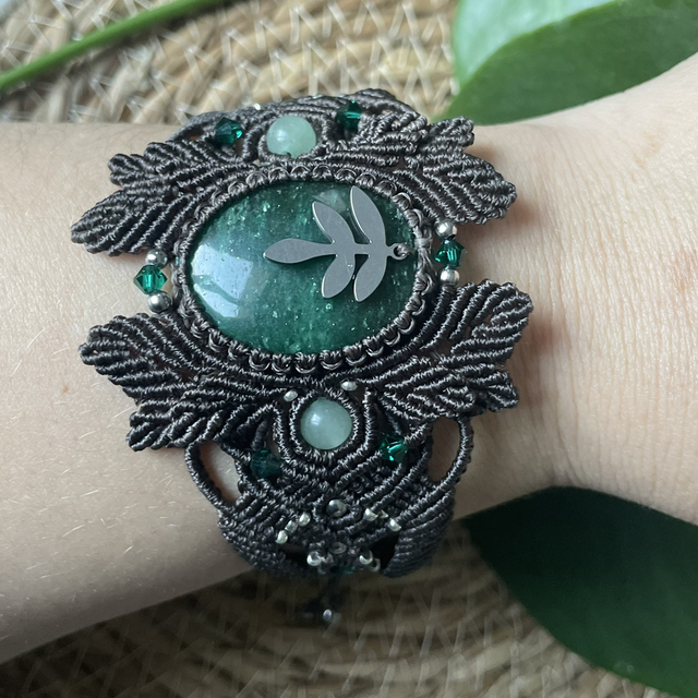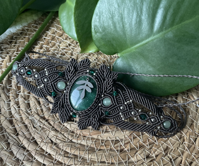 La pierre centrale est une aventurine avec inclusions de mica , des pierres d'aventurine de 6 mm sont intégrées dans le tissage ainsi que des perles de cristal autrichien de couleur émeraude pour apporter de l'éclat au bijou.
