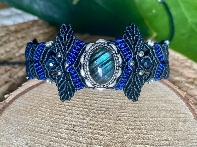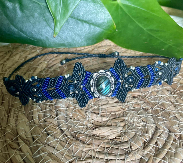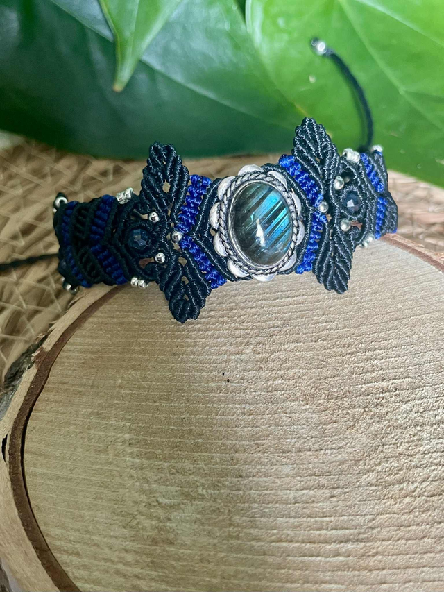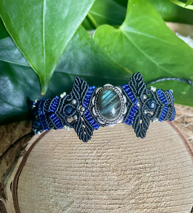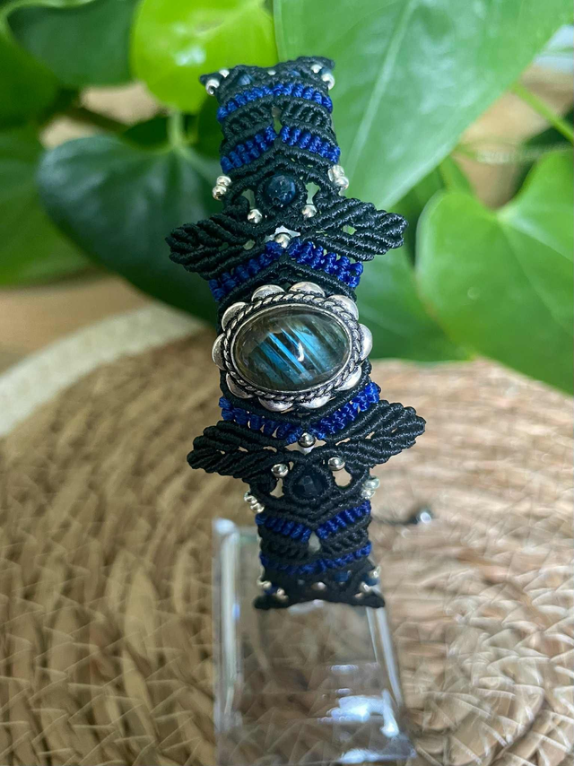 La pierre centrale est une labradorite sertie de laiton , des pierres de cyanite facettées de 4mm sont intégrées dans le tissage .