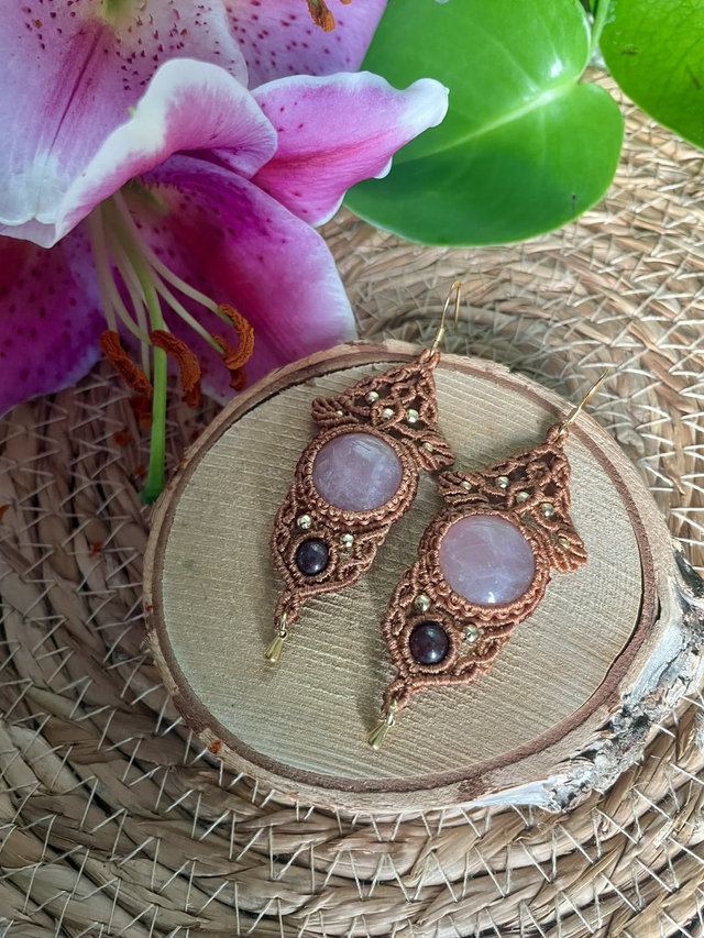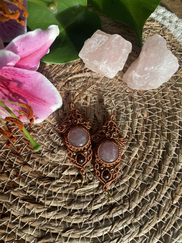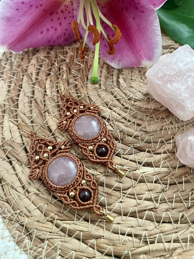 La pierre centrale sont des quartz rose , des pierres de 6mm de grenat sont intégrées dans le tissage.