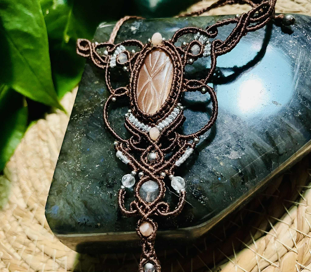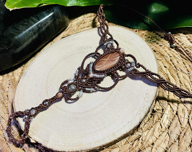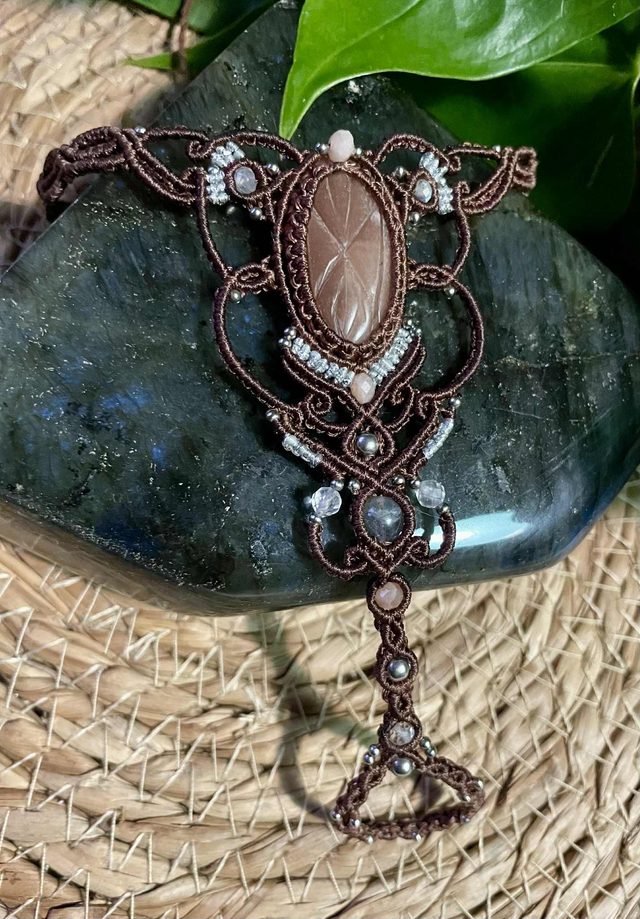 Dans le tissage , on retrouve des perles de pierre de lune facettées, de labradorite , de cristal de roche facettées et des perles en acier inoxydable.