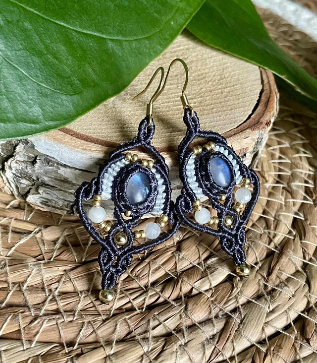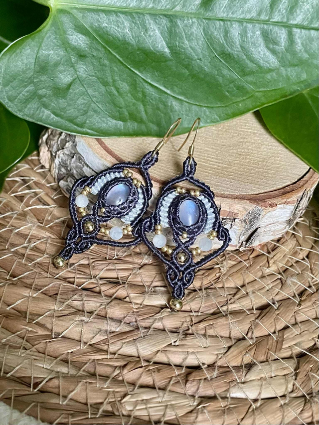 Boucles d'oreilles tissées à la main en France avec la technique du micro macramé.