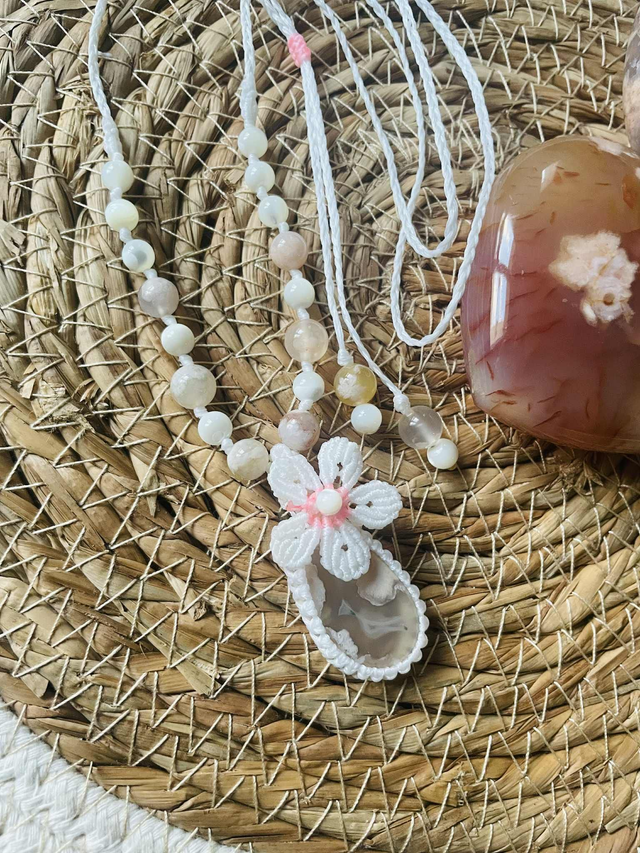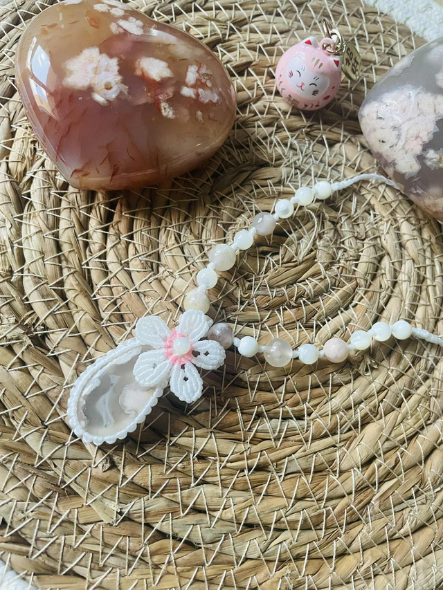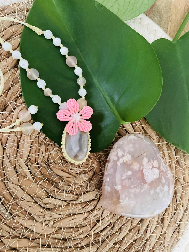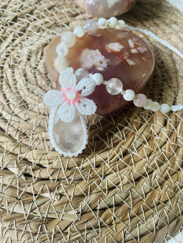 La pierre centrale est une agate fleur de cerisier et les pierres sont des agates fleur de cerisier et de nacre.